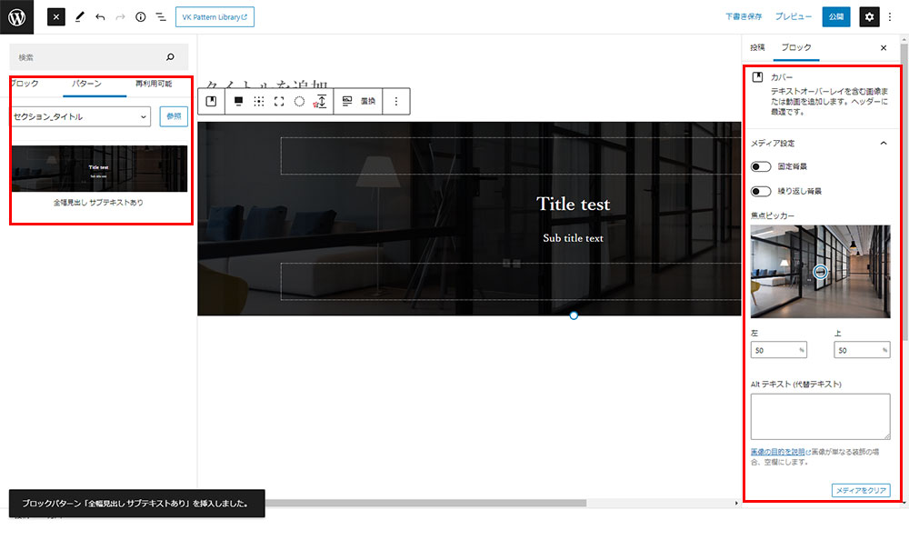 - ブロックエディタ(Gutenberg)VK Block Patterns セクション_タイトル(全幅見出しとサブテキストあり)の使い方がわからない?