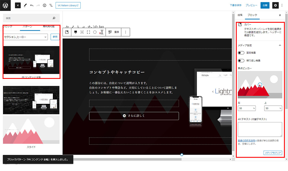 • ブロックエディタ(Gutenberg)VK Block Patterns セクション_ヒーロー(PR コンテンツ 全幅)の使い方を紹介します。