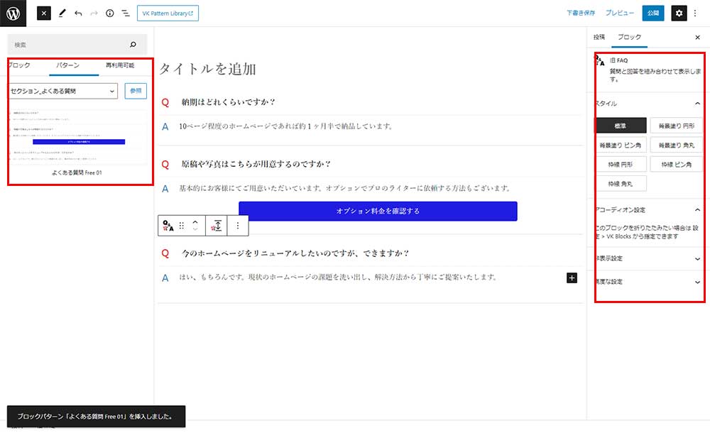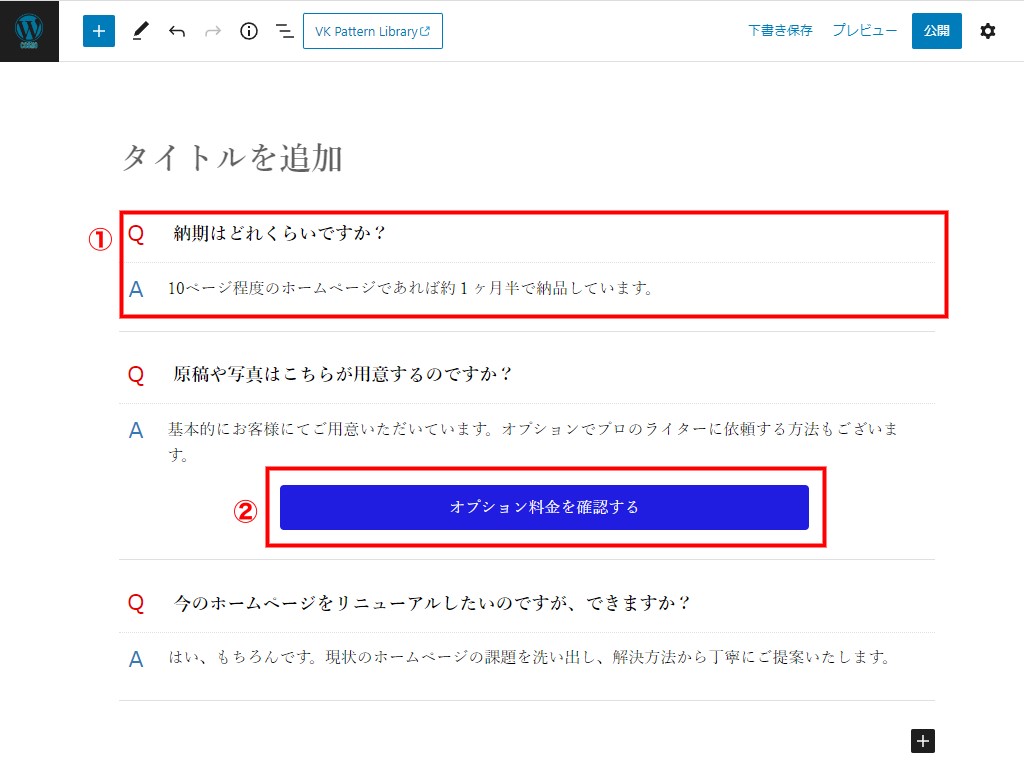 - ブロックエディタ(Gutenberg)VK Block Patterns セクション_よくある質問(よくある質問 Free 01)の使い方がわからない?