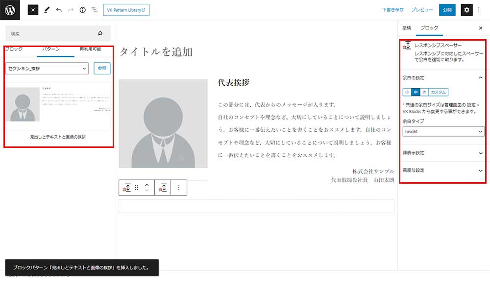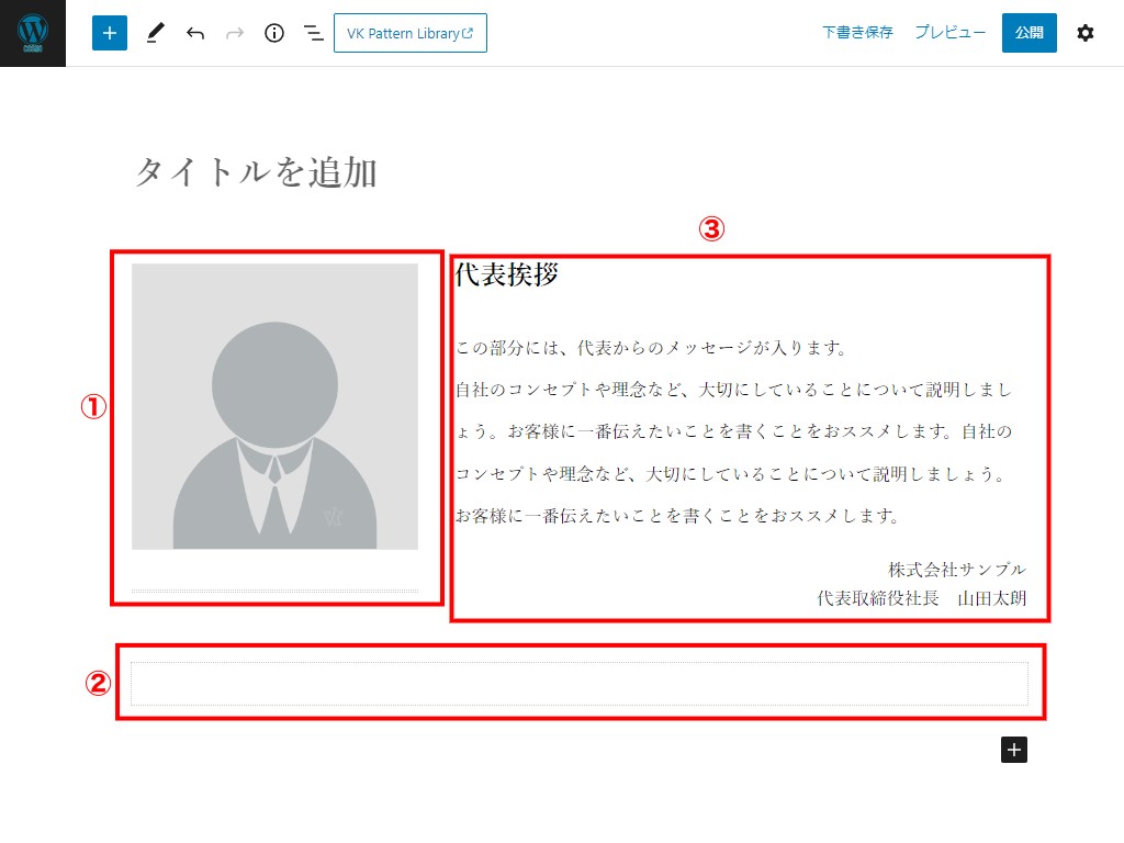 - ブロックエディタ(Gutenberg)VK Block Patterns セクション_挨拶(見出しとタイトルと画像の挨拶)の使い方がわからない?