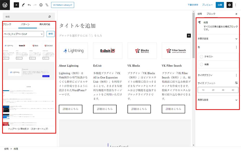 - ブロックエディタ(Gutenberg)VK Block Patterns ページ_トップページ/LP(トップページ無料版 01<スタータートップ>)の使い方がわからない?
