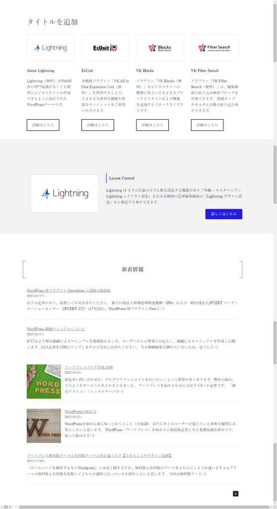 ブロック挿入時の画面を見ていただければ、お分かりいただけますがホームページのTOPに必要な要素が最低限用意されているパターンです。
