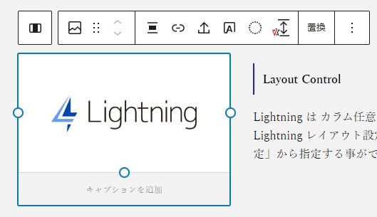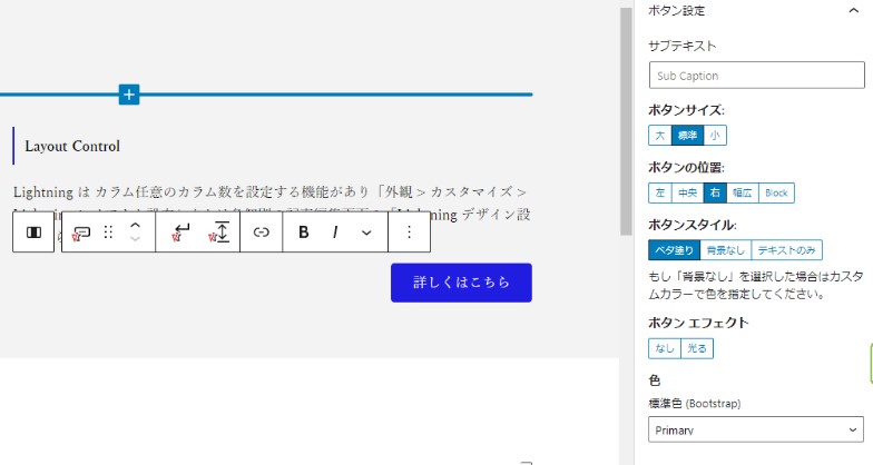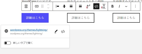 PR画像は上記同様「置換」より画像を選択しなおしが可能です。リンクボタンは上部とちょっと違いリンクのURL入力欄はブロックツールバーのリンクアイコンから指定します。その他ボタンの装飾は右側のパネル記事全体より行えます。テキスト部分は上書き修正が可能です。