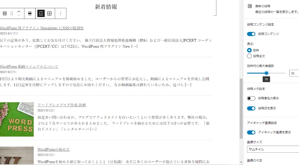 新着情報の表示方法はブロックツールバーより選択。表示内容の修正は右側のパネル記事全体より行えます。