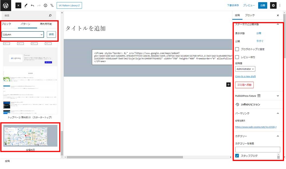 VK Block Patterns幅_全幅(全幅地図)の設置にはブロックを追加する時に「すべて表示」をクリックすると画面左にパネルが表示され、その中に「パターン」という項目からボタンのカテゴリーの各パターンのボタンの中から何種類かの幅全幅(全幅地図)を選択して利用します。