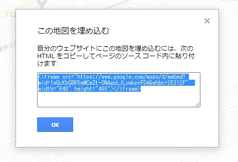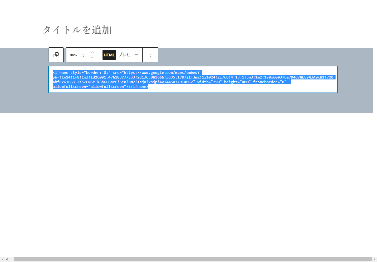 事前に目的地をGoogleMapのマイマップから「自分のサイトに埋め込む」よりコードをコピーするブロック挿入後既に入力されているコードを上書き編集します。地図が表示されている場合は「HTML」をクリックしますとコード入力画面が表示されます。