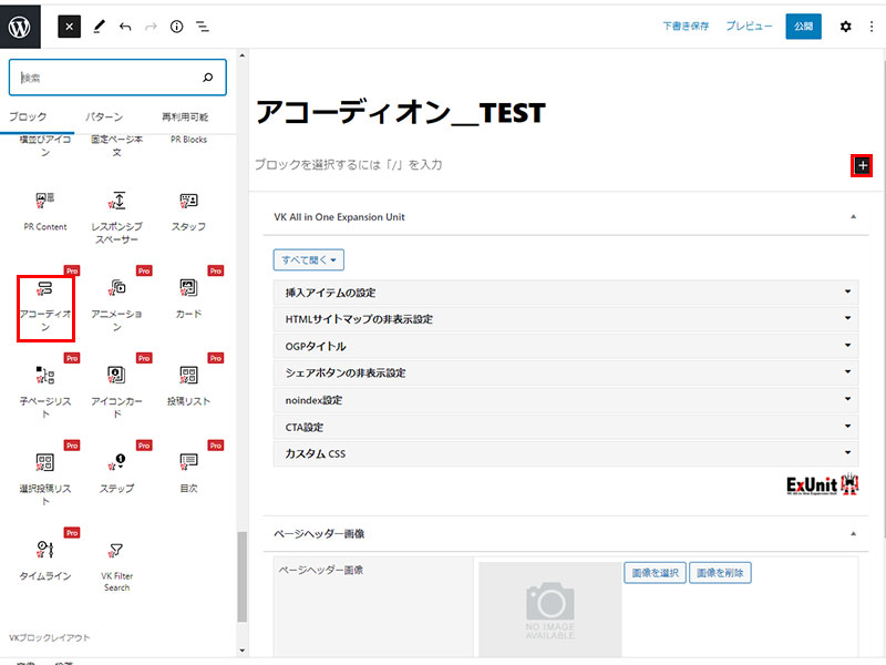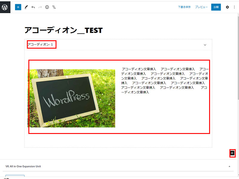 適宜見出し部分のテキスト、今回はカラム1/2を設定後画像と段落を挿入してみました。新たにアコーディオンが必要な場合は右下の+マークアイコンよりアコーディオンを追加してください。