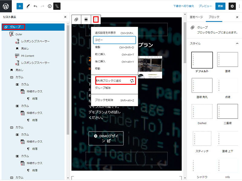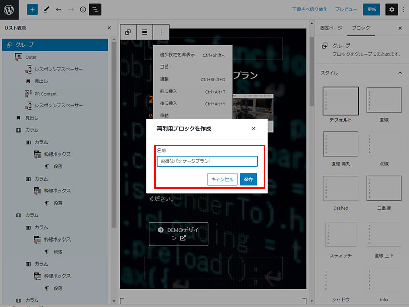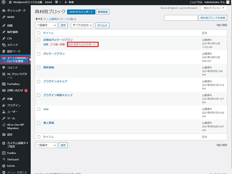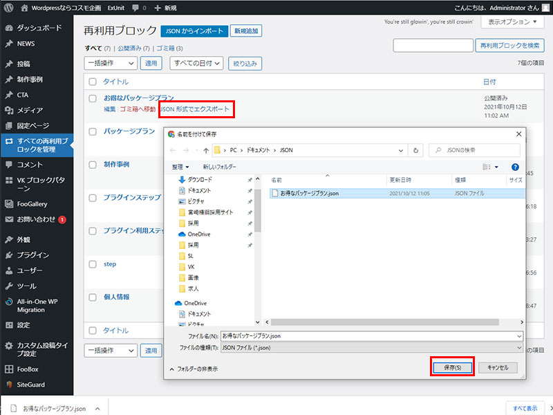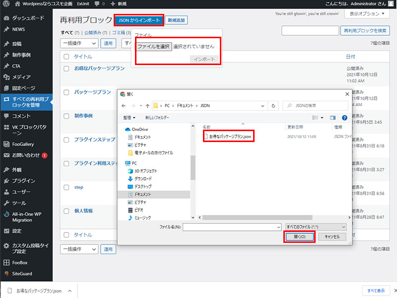 2021年10月12日 2022年9月23日 Administrator WordPress テーマ他 WordPress VK ブロック の再利用ブロックの外部保存・取り込みのの使い方 せっかく制作した再利用ブロックを違うサイトでも活用できると便利ですよね! 再利用ブロックへの保存 リスト表示で保存するエリアを指定する。ツールバーの赤枠部分(右端)の「再利用ブロックに追加」をクリックし保存を完了。 STEP1 外部に保存(エクスポート) JSON形式でエクスポート(赤枠)をクリックし、操作しているPCの任意のディレクトリに保存(Windowsの保存方法 同様の作業) STEP2 取り込み(インポート) JSONからインポートをクリックし、操作しているPC内の保存ファイルを「開く」で選択後「インポート」を実行し保存してください。※インポート直後は表示されません。リフレッシュ(サイトの更新)を行えば表示されます。 STEP3 Follow me! @webplannercosmo コメントを残す コメントをキャンセルメールアドレスが公開されることはありません。 ※ が付いている欄は必須項目ですコメント ※ 名前 ※ メール ※ サイト 次回のコメントで使用するためブラウザーに自分の名前、メールアドレス、サイトを保存する。 Δ