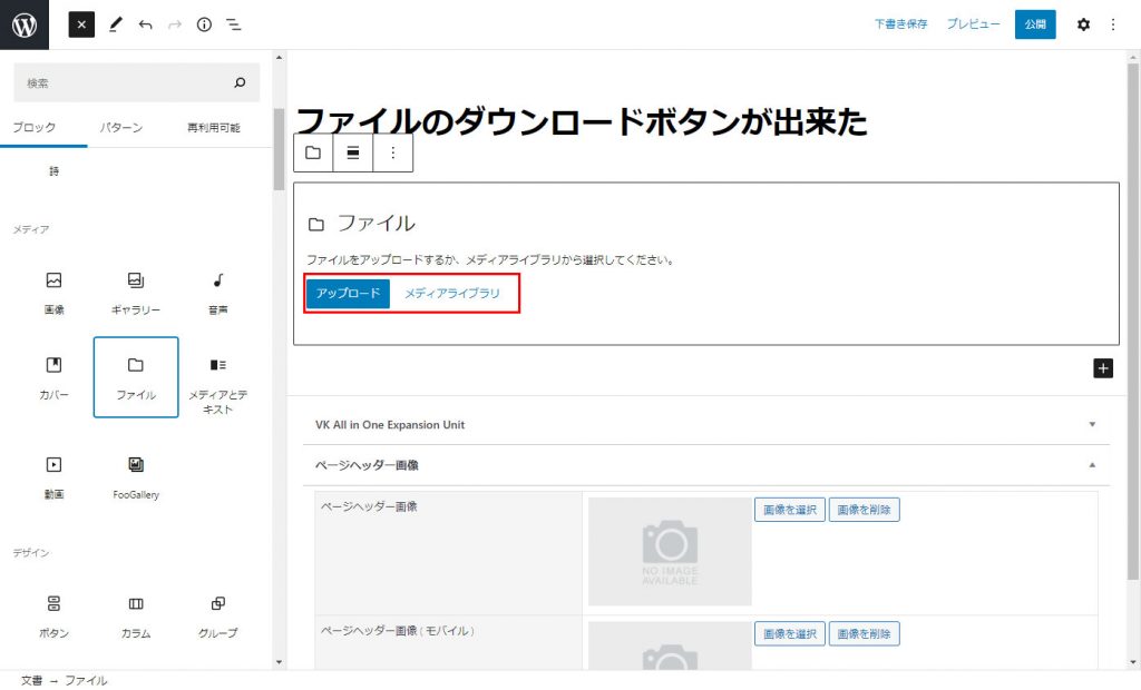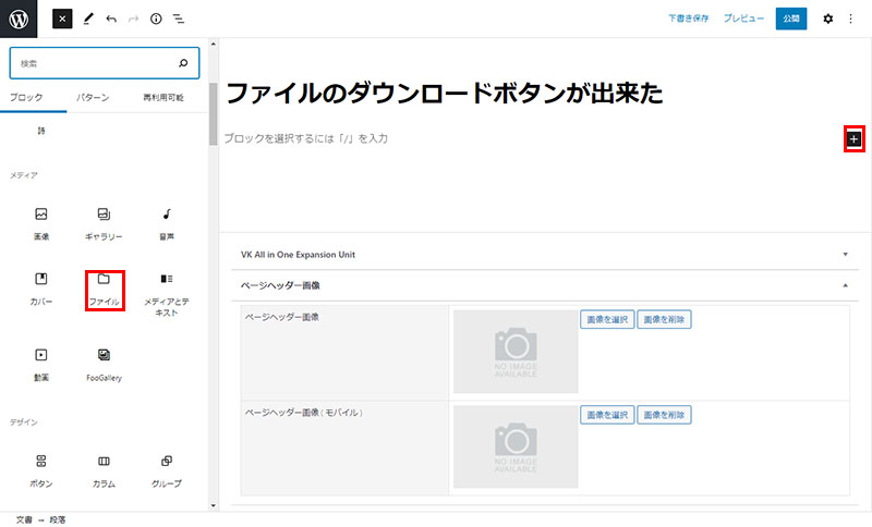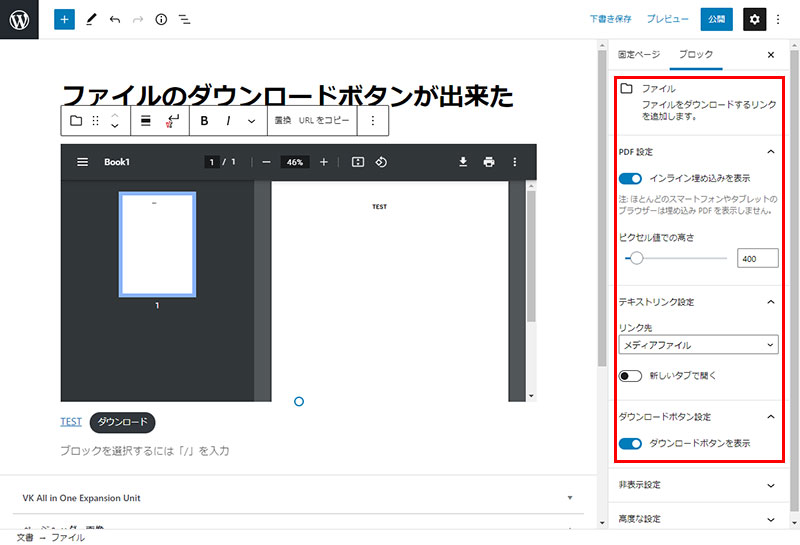 2021年10月17日 2022年9月23日 Administrator VKブロックPROWordPress テーマ他 ブロック ファイルを制作-の使い方 WordPressのファイルのインラインフレームによる表示やダウンロードが簡単に表示できるようになった。 ボックス挿入~設定方法 +マークのアイコンをクリックしブロック選択 メディアよりファイルを選択後ファイル(PDFファイルなど)選択の入り口が表示されます。 右側のファイル設定でインラインなどの設定を行う。 こんな感じで表示 STEP1 Follow me! @webplannercosmo コメントを残す コメントをキャンセルメールアドレスが公開されることはありません。 ※ が付いている欄は必須項目ですコメント ※ 名前 ※ メール ※ サイト 次回のコメントで使用するためブラウザーに自分の名前、メールアドレス、サイトを保存する。 Δ