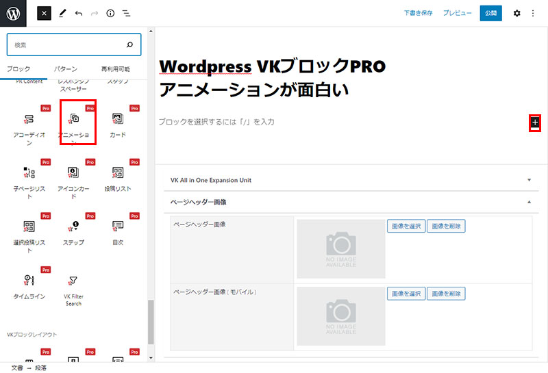 VK BLOCKSPRO よりsにメーションを選択後テンプレートが表示されます。