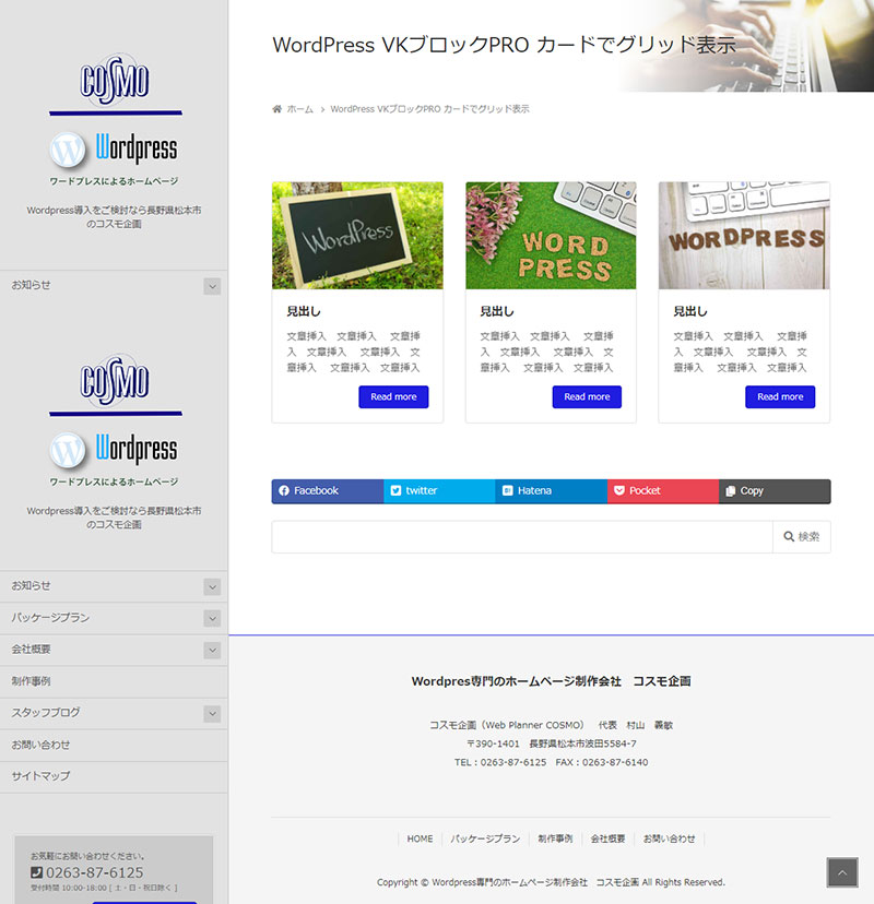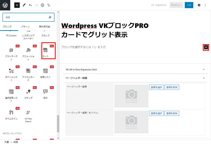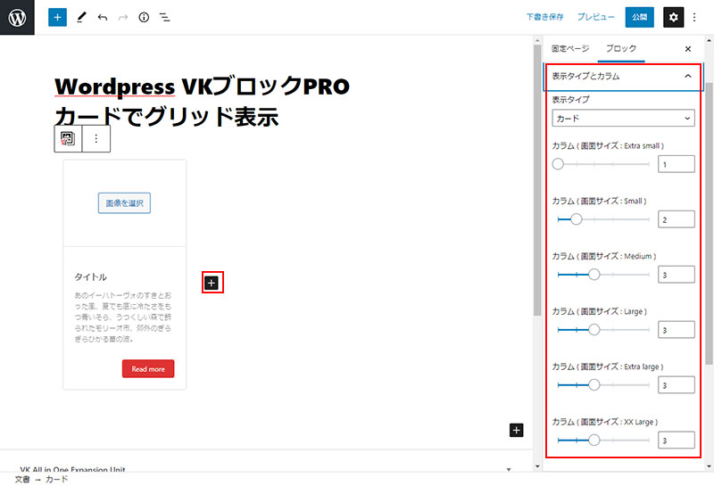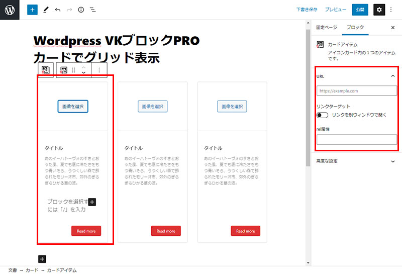 2021年10月20日 2022年9月23日 Administrator VKブロックPROWordPress テーマ他 VKブロックPRO カードでグリッド表示-の使い方 カード形式の一覧表示(可変長)がグリッド表示が簡単にできます。従来のクラシックエディタと比較してもっとも簡単なブロック編集といえます。 ボックス挿入~設定方法 +マークのアイコンをクリックしブロック選択画面を開く VK BLOCKSPRO よりカードを選択後テンプレートが表示されます。 画面右側の設定画面で設定を行います。カードの横の+マークをクリックするとカードが増えます。 こんな感じで表示 STEP1 Follow me! @webplannercosmo コメントを残す コメントをキャンセルメールアドレスが公開されることはありません。 ※ が付いている欄は必須項目ですコメント ※ 名前 ※ メール ※ サイト 次回のコメントで使用するためブラウザーに自分の名前、メールアドレス、サイトを保存する。 Δ