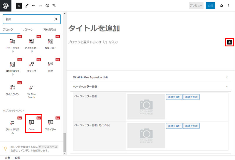 VK BLOCKSPRO よりOuterを選択後ブロックが表示されます。