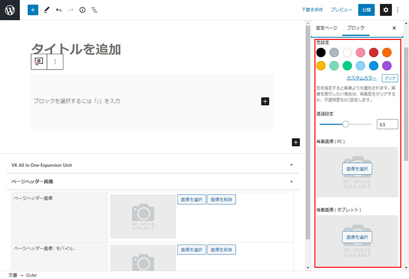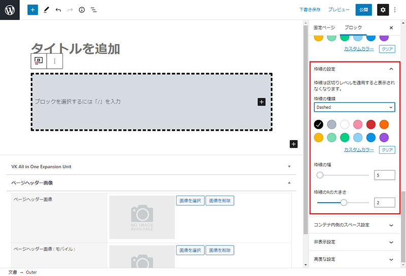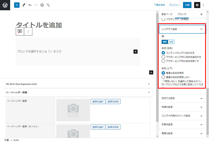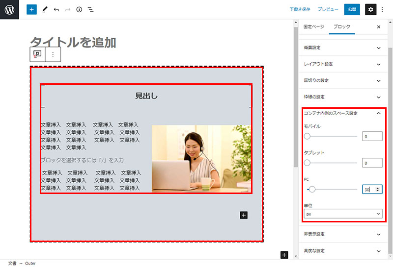 Outer ブロックはその名の通り、コンテンツの外側となるブロックを指します。Outerブロックを配置して、その中にPR Content ブロックなど他のブロックを入れて運用することを想定しています。
