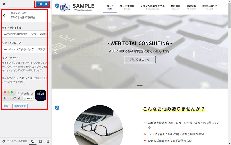 WordPress テーマ「Lightning」のホームページ作成にあたり「サイト基本情報」の設定方法を説明いたします。
