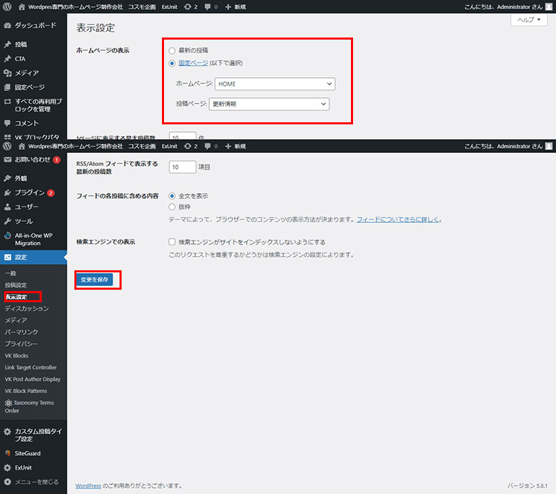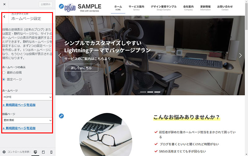 2021年10月30日 2022年10月31日 Administrator Lightningwebデザイン(企業サイトの作り方) Lightning(ホームページ設定)の使い方 このサイトでは何を教えてくださるの? コスモ企画 この記事は以下のような方におすすめ! WordPressのテーマ Lightning(ホームページ設定)の使い方がわからない?WordPressのテーマ Lightning(ホームページ設定)の使い方を紹介します。 WordPressのLightningの設定方法(ホームページ設定)について説明します。 設定方法 ダッシュボード>外観>カスタマインズの順でクリック ダッシュボード>外観>カスタマインズ>ホームページ設定の順でクリック 左側の設定画面で表示するページなど選択します。 STEP1 ホームページ設定の設定別方法 ダッシュボード>設定>表示設定の順でクリック。 赤枠の部分を設定し最後に「変更を保存」の青いボタンをクリックしましょう。 STEP2 Follow me! @webplannercosmo コメントを残す コメントをキャンセルメールアドレスが公開されることはありません。 ※ が付いている欄は必須項目ですコメント ※ 名前 ※ メール ※ サイト 次回のコメントで使用するためブラウザーに自分の名前、メールアドレス、サイトを保存する。 Δ
