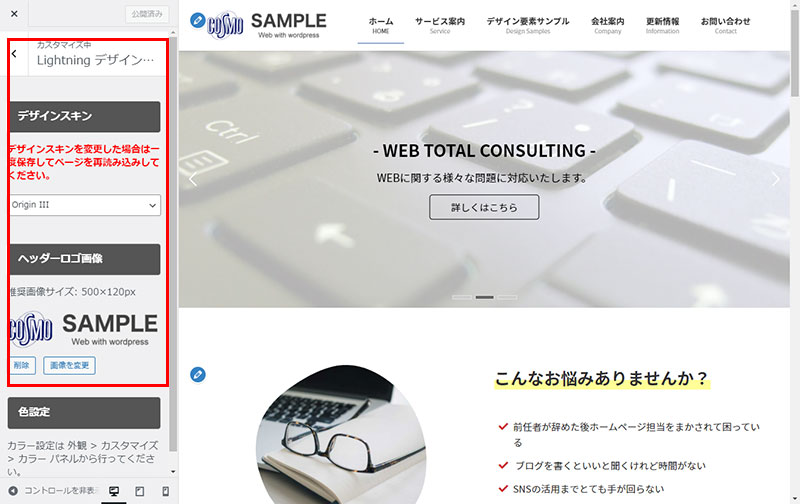 2021年10月31日 2022年10月31日 Administrator Lightningwebデザイン(企業サイトの作り方) Lightning(デザイン設定)の使い方 このサイトでは何を教えてくださるの? コスモ企画 この記事は以下のような方におすすめ! WordPressのテーマ Lightning(デザイン設定)の使い方がわからない?WordPressのテーマ Lightning(デザイン設定)の使い方を紹介します。 WordPressのLightningの設定方法(デザイン設定)について説明します。 設定方法 ダッシュボード>外観>カスタマインズの順でクリック ダッシュボード>外観>カスタマインズ>デザイン設定の順でクリック 左側の設定画面で表示するページなど選択します。ヘッダ部分の絵尾後の設定を行います。500px×120pxが推奨画像サイズ※追加CSS、Lightning CSS最適化Lightning 機能設定はあえて設定の必要はないでしょう! STEP1 Follow me! @webplannercosmo コメントを残す コメントをキャンセルメールアドレスが公開されることはありません。 ※ が付いている欄は必須項目ですコメント ※ 名前 ※ メール ※ サイト 次回のコメントで使用するためブラウザーに自分の名前、メールアドレス、サイトを保存する。 Δ
