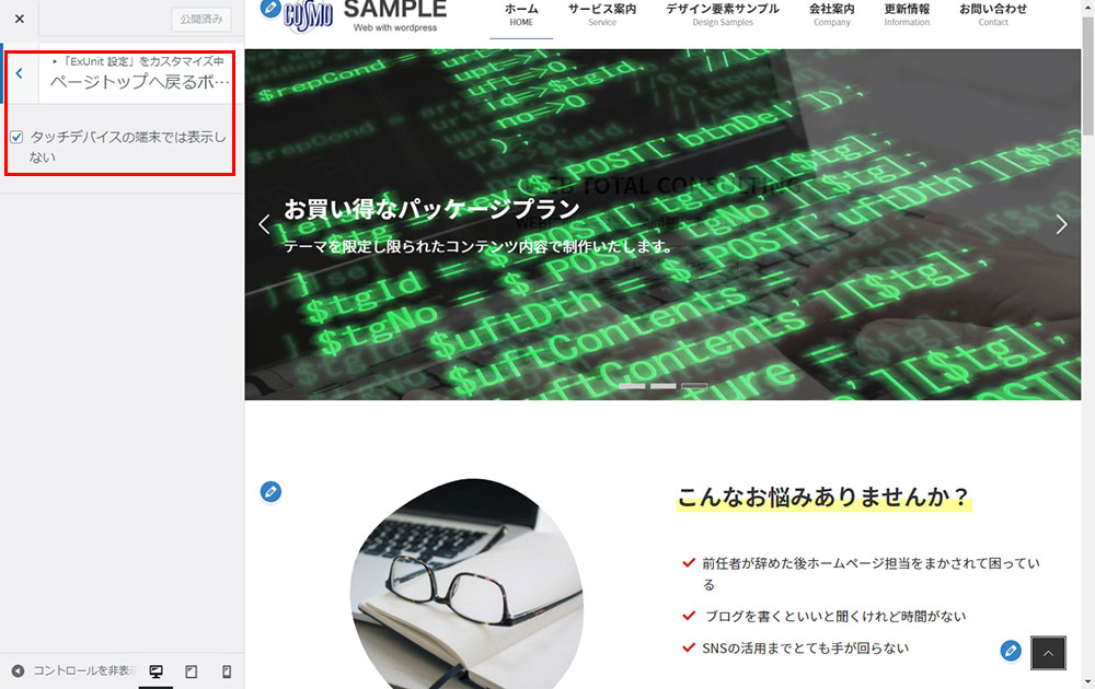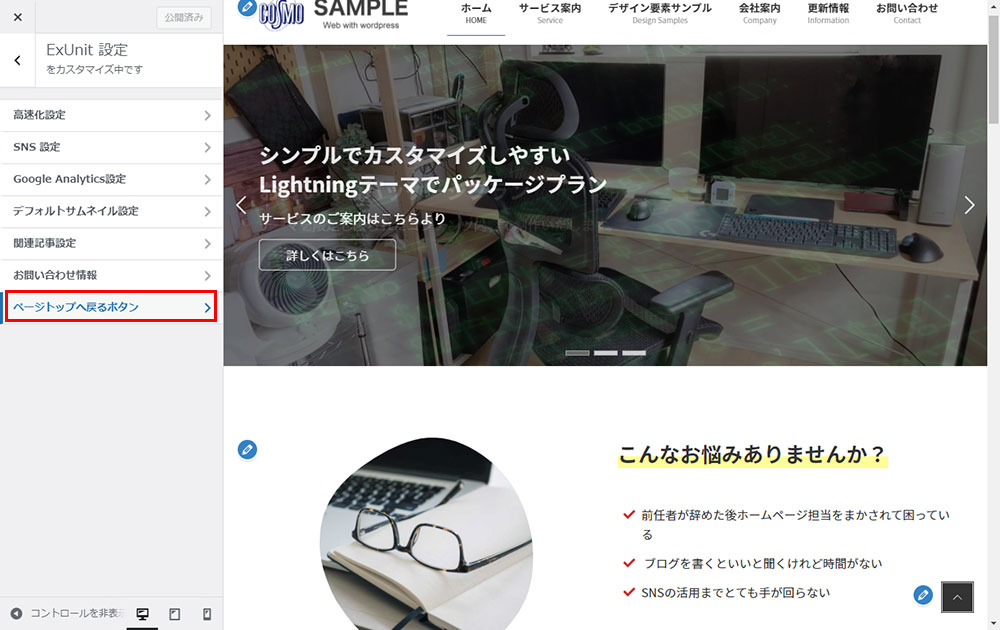 WordPressのLightningの設定方法(ExUnit 設定-ページトップへ戻るボタン)について説明します。
