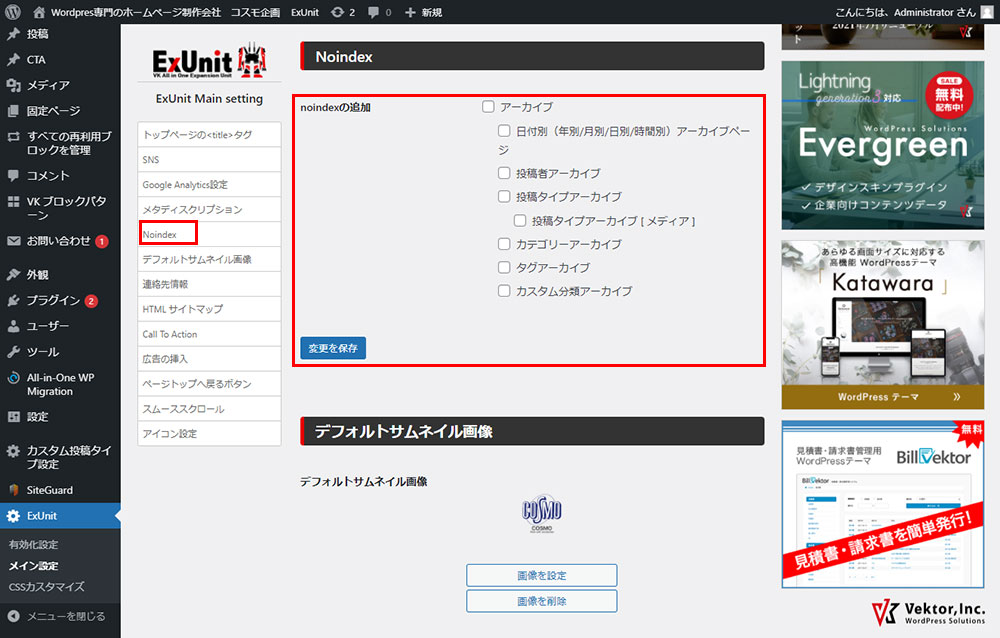 2021年11月19日 2022年9月23日 Administrator VK All in One Expansion Unitwebデザイン(企業サイトの作り方) Lightning(ExUnit 設定-メイン設定【Noindex】)の使い方 WordPressのLightningの設定方法(ExUnit 設定-メイン設定【Noindex】)について説明します。 設定方法 ダッシュボード>ExUnit>メイン設定【Noindex】と進みクリックします。 Googleの検索エンジンindexされないように事前に設定が出来ます。もちろんページ単位にも設定は可能です。 STEP1 Follow me! @webplannercosmo コメントを残す コメントをキャンセルメールアドレスが公開されることはありません。 ※ が付いている欄は必須項目ですコメント ※ 名前 ※ メール ※ サイト 次回のコメントで使用するためブラウザーに自分の名前、メールアドレス、サイトを保存する。 Δ