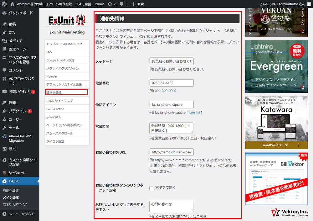 WordPressのLightningの設定方法(ExUnit 設定-メイン設定【連絡先情報】)について説明します。