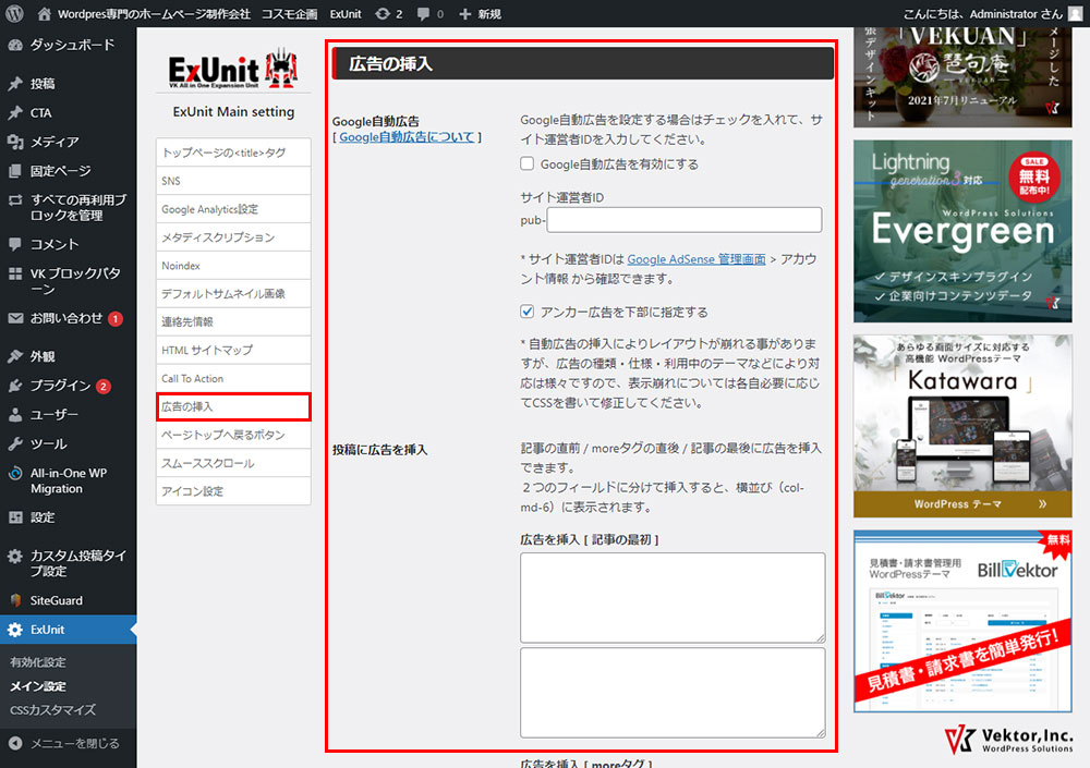 WordPressのLightningの設定方法(ExUnit 設定-メイン設定【広告の挿入】)について説明します。
