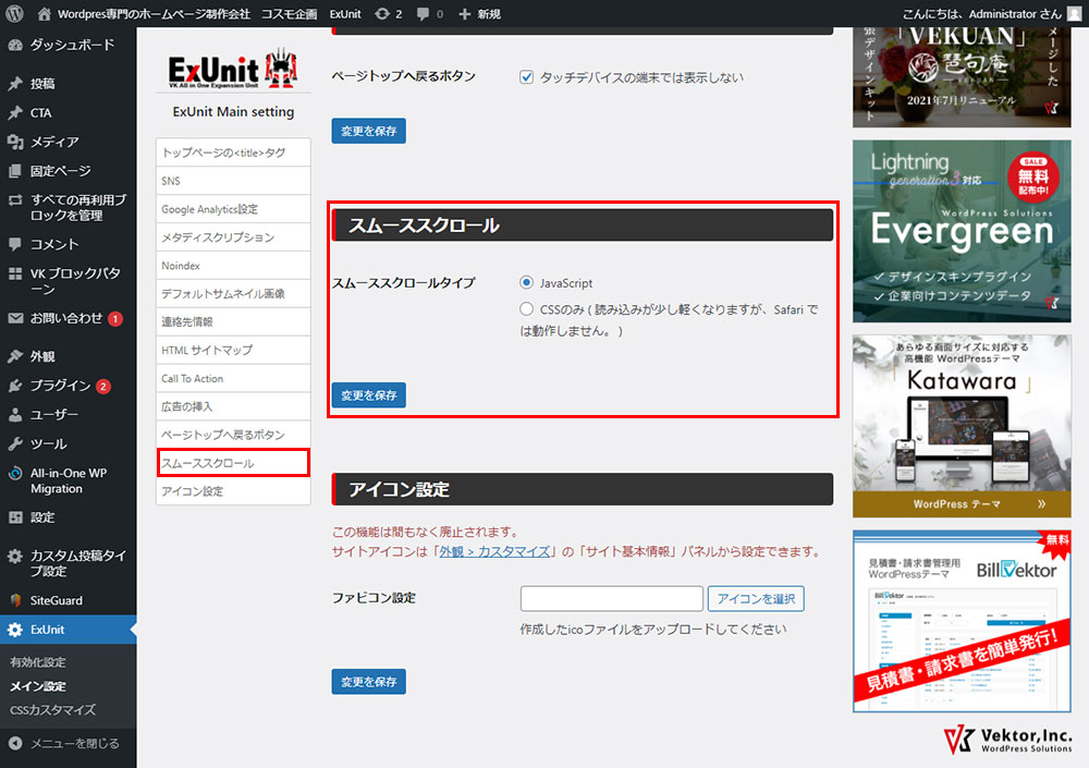WordPressのLightningの設定方法(ExUnit 設定-メイン設定【スムーススクロール】)について説明します。