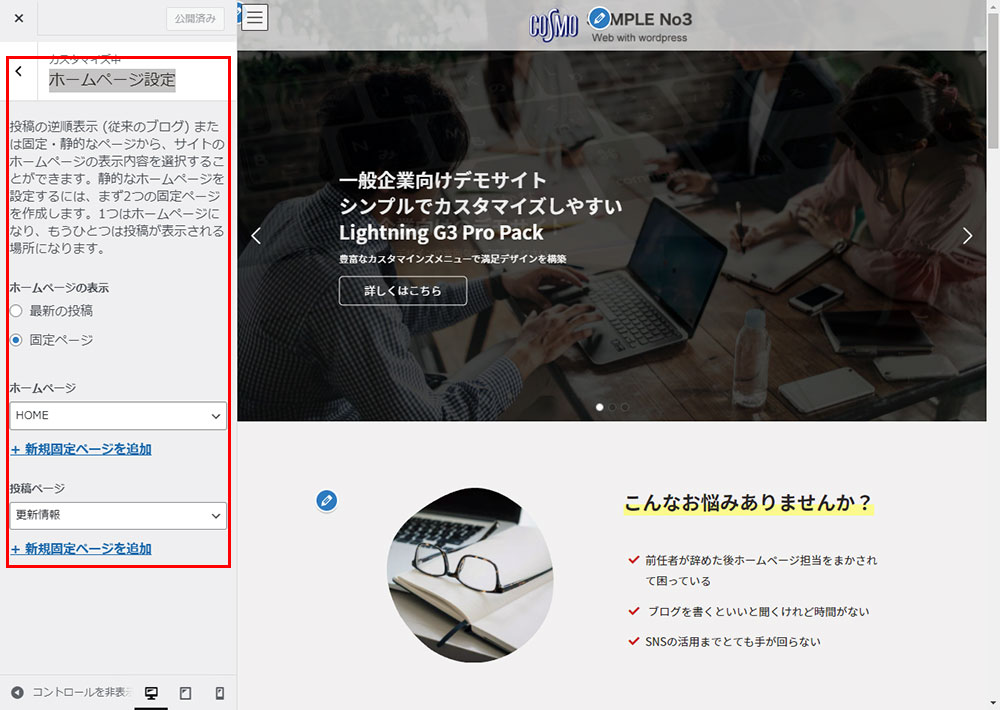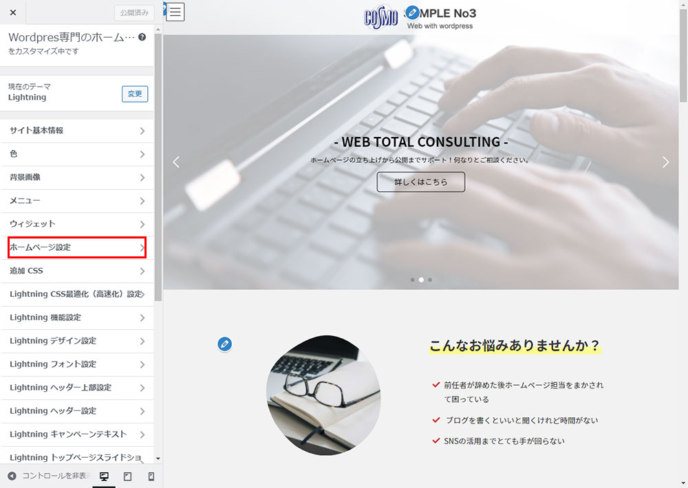 WordPressのLightning G3 Pro Unitの設定方法(ホームページ設定)について説明します。