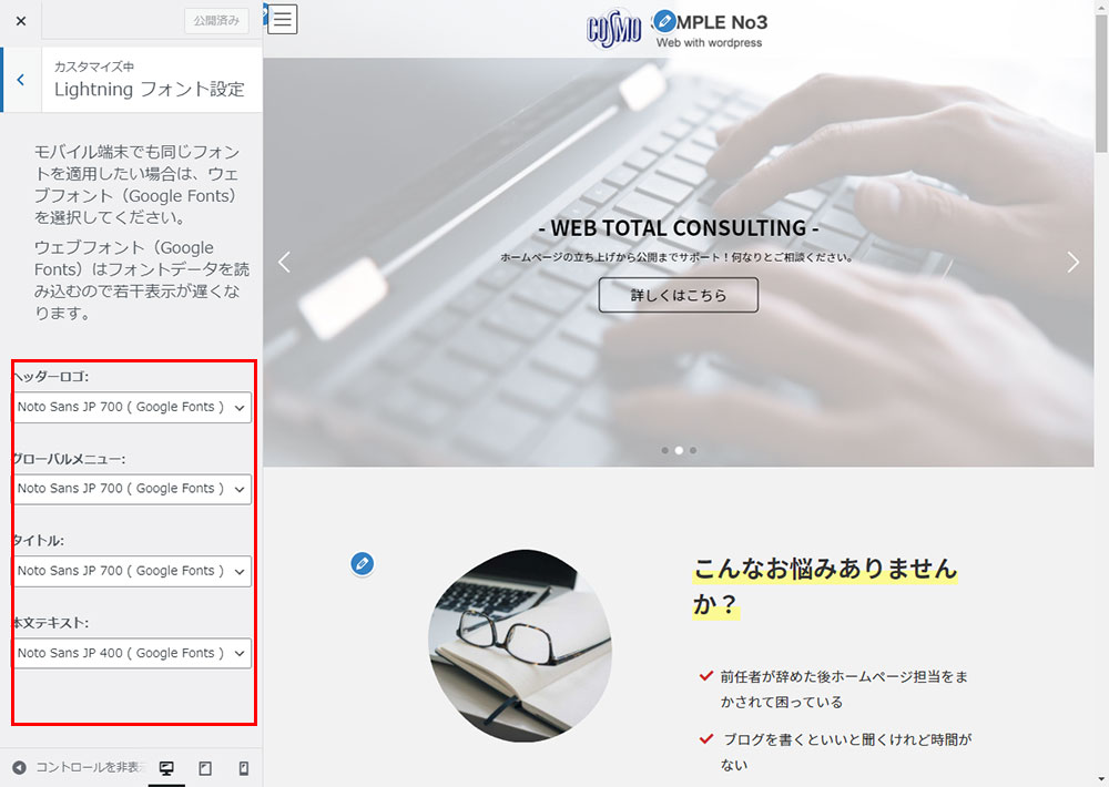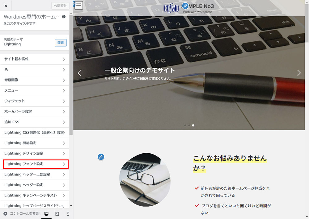 WordPressのLightning G3 Pro Unitの設定方法(Lightningフォント設定)について説明します。