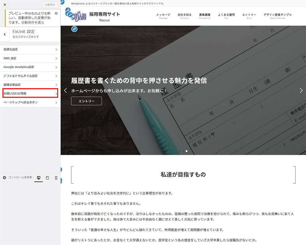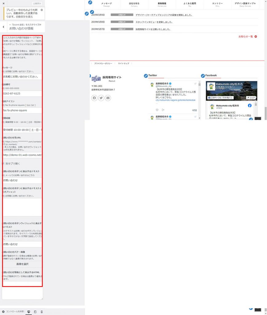ここに入力された内容が各固定ページ下部や『お問い合わせ情報』ウィジェット、『お問い合わせボタン』ウィジェットなどに反映されます。