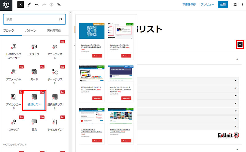 図表の赤枠通り、プラスのアイコンのボックス挿入をクリック、VKブロックPRO内に「投稿リスト」を選択。