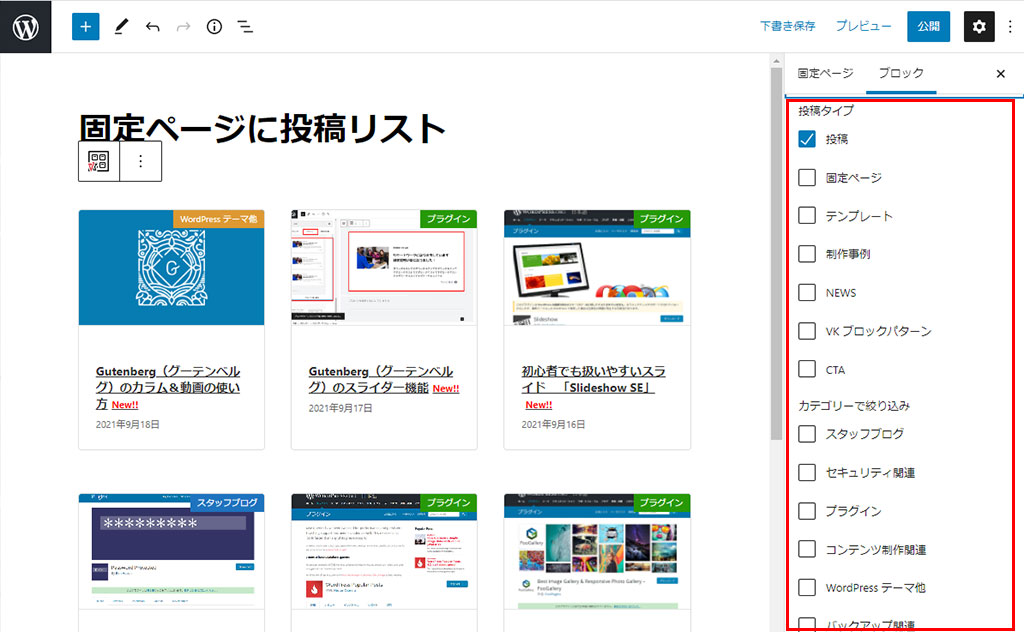 ブロックの編集より投稿タイプを選択する画面において