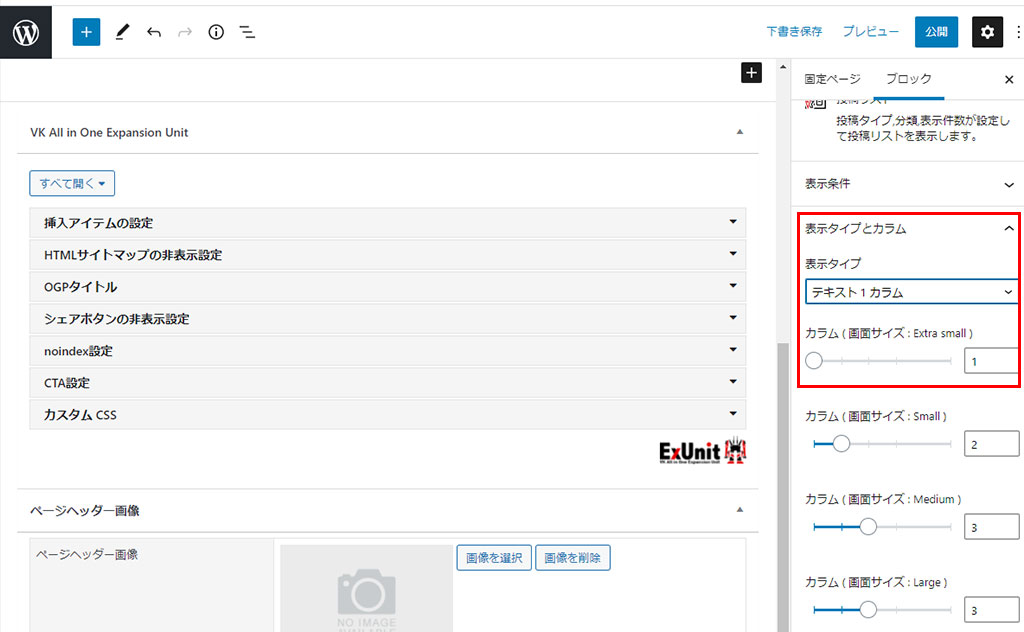 表示タイプとカラム数を選択今回の場合はNEWSなので「テキスト1カラム」を選択。