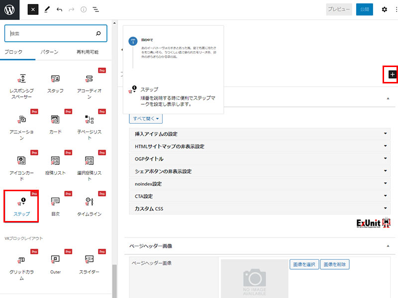 +マークのボックス追加からvkブロックPRO内の「ステップ」をクリック