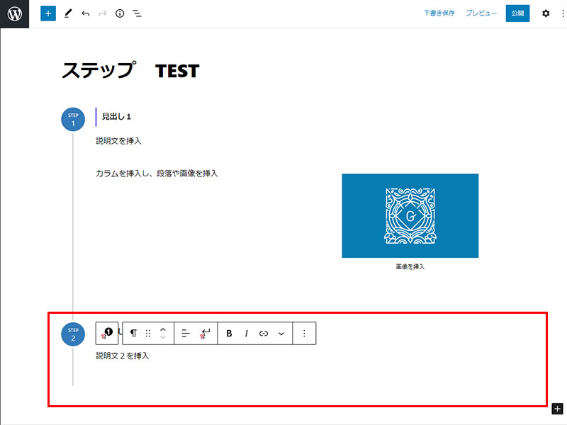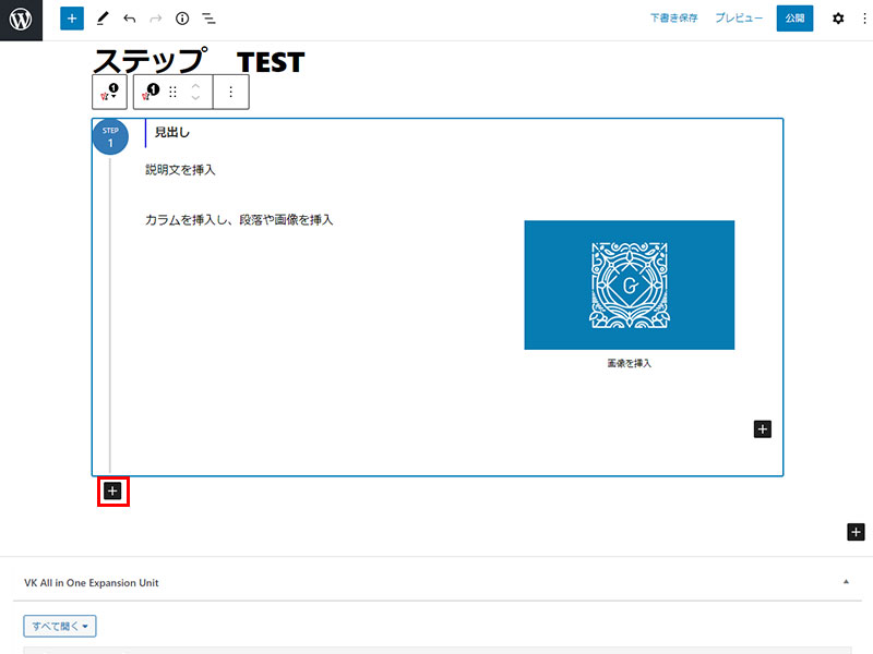 次のステップを挿入する場合は、左下(図表赤枠参照)をクリックすると自動的にSTEP2が挿入されるので自動的にステップが挿入され、適宜見出し文章を挿入しましょう。