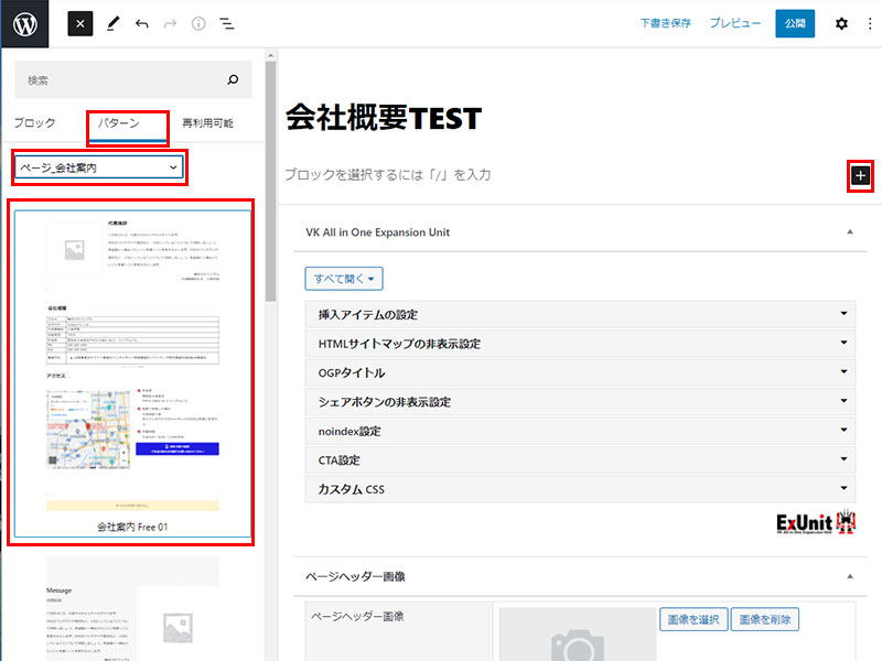 赤枠の+マークのアイコンをクリックしてボックスを挿入。パターン内のページ_会社案内を選択。