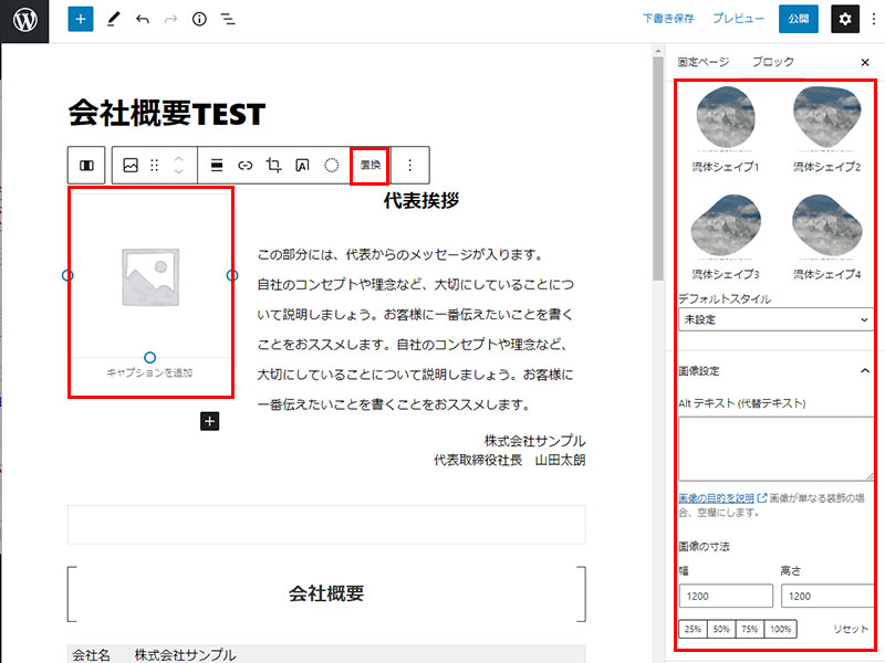 適宜該当パーツ(ブロック)を修正。上記の場合、代表者の写真をサンプルから置き換える場合、赤枠をクリックして写真を置き換える。適宜右側の設定画面から編集する。