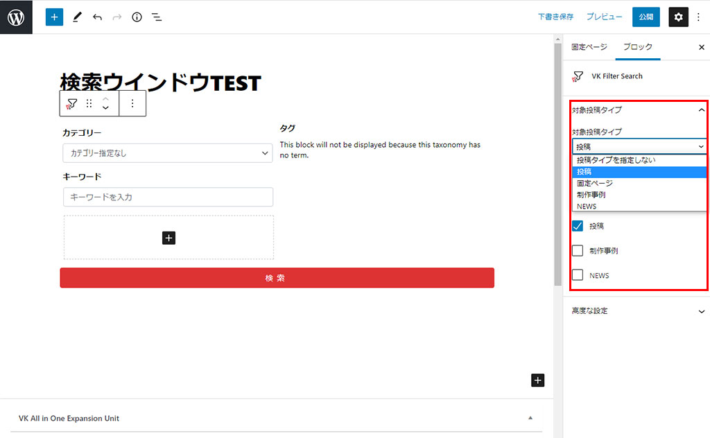対象投稿タイプをプルダウンから選択(今回は投稿)ほかにもカスタム投稿を選択できる。