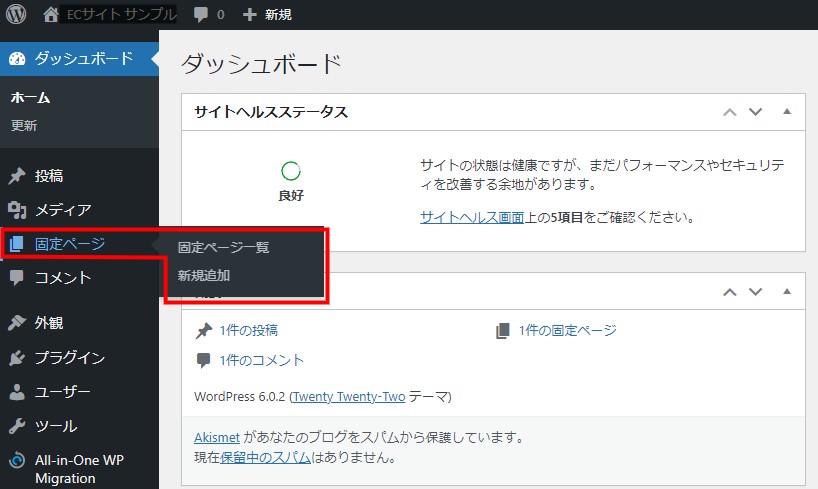 固定ページはダッシュボード内の左サイドメニュー「固定ページ」から作成や編集ができます。