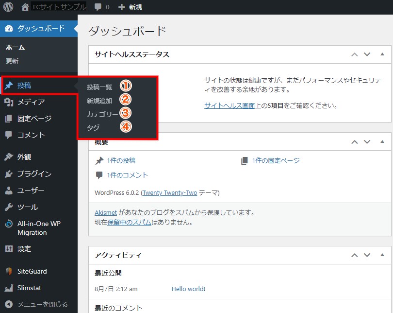投稿にカーソルをあわせると「①:投稿一覧」「②:新規追加」「③:カテゴリー」「④:タグ」という選択肢が表示されます。