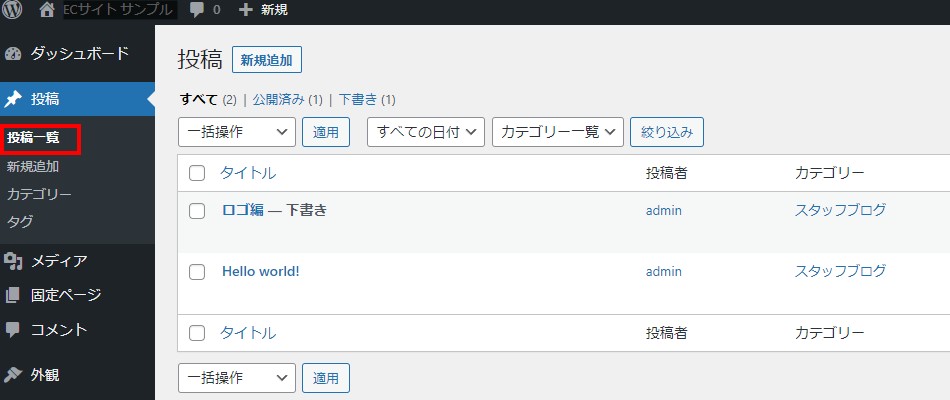 投稿をすぐに公開するのではなく、下書きとして保存します。後で下書きに戻るには管理画面の投稿の一覧で、下書きの投稿を選択します。