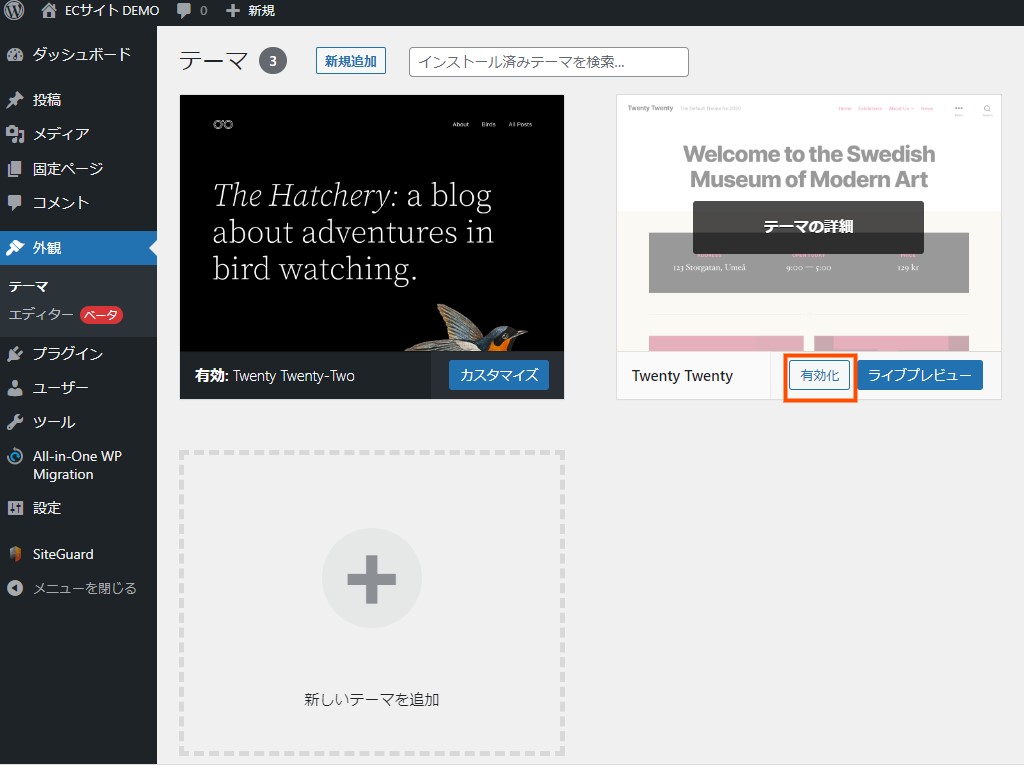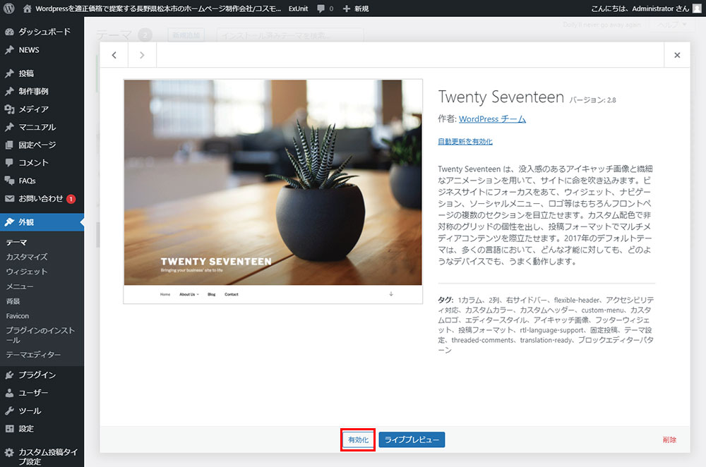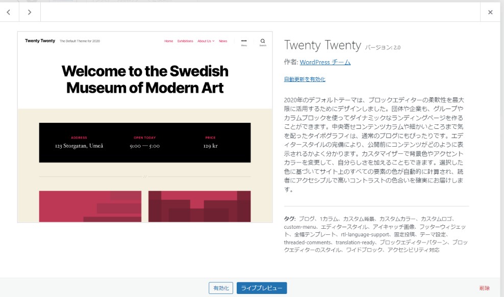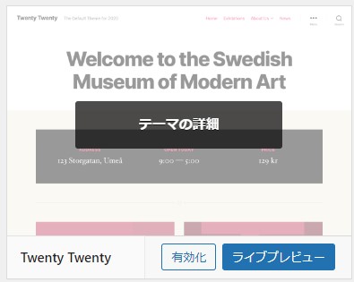 ワードプレスは最初からインストールされているテーマはWordPress開発チームが制作したテーマ(Twentyなど)が有効化(設定)しています。
