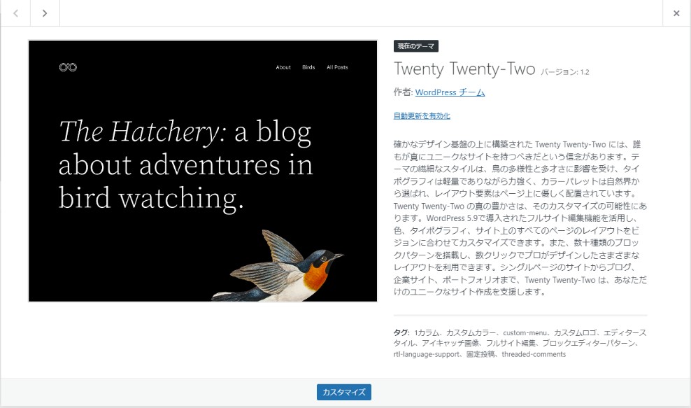 カスタマイズ (現在有効中のテーマのみ):カスタマイザ画面を通じてテーマをプレビュー表示します。