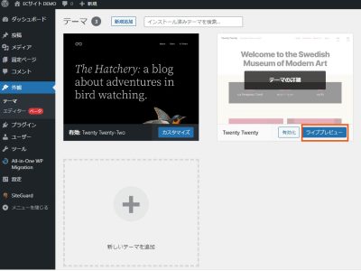 現在のテーマは「カスタマイズ」ボタンをクリック、他のテーマは「ライブプレビュー」ボタンをクリックしライブビューにて確認します。