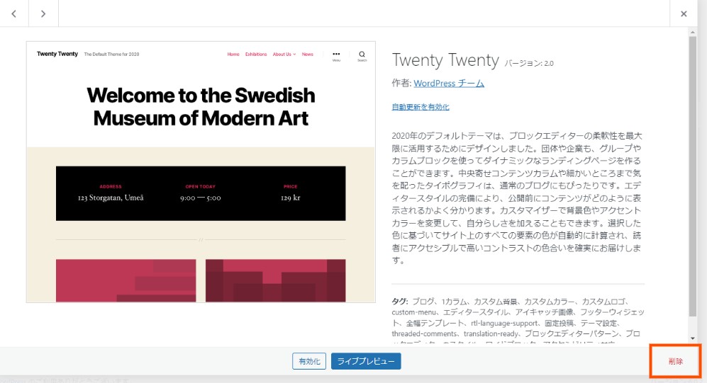 テーマの詳細をクリック後、右側下部の「削除」をクリックし、インストールしているテーマを削除します。