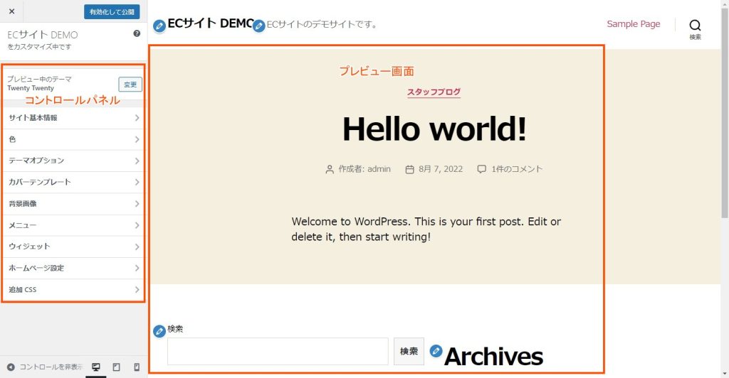 ライブプレビュー:カスタマイザ画面を通じてテーマをプレビュー表示します。