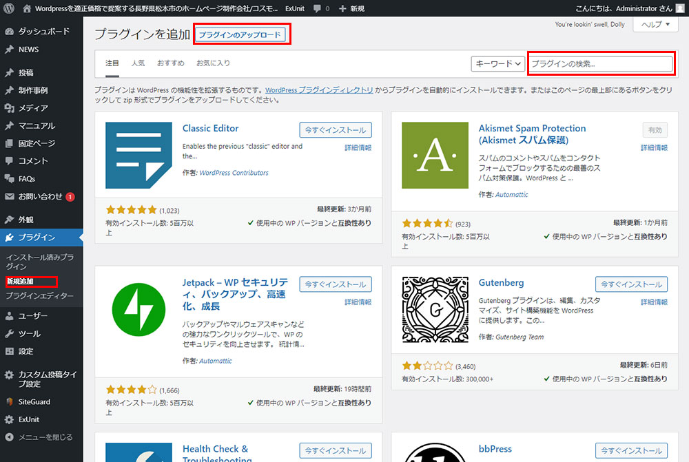 WordPressのプラグインの使い方:プラグイン→新規追加プラグインを検索~インストール