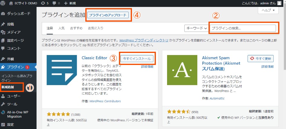 4. プラグインによっては圧縮ファイル(※※※.zip)からアップロードしてインストールする場合もあります。④「プラグインのアップロード」より画面の指示に従って進めましょう。