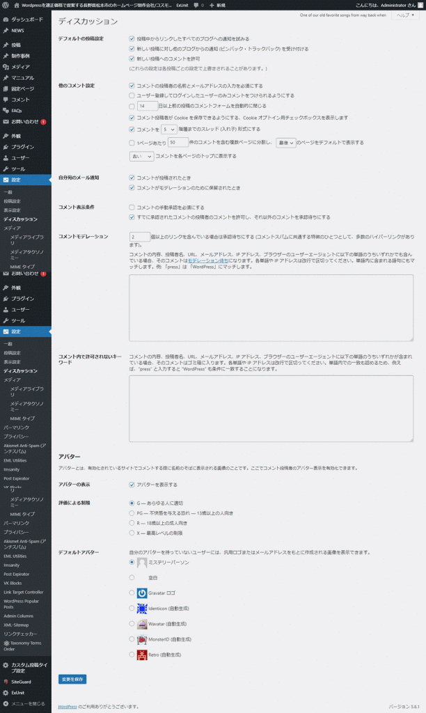 管理画面のメニューで「設定→ディスカッション」の順にクリックするとディスカッション設定の画面になります。