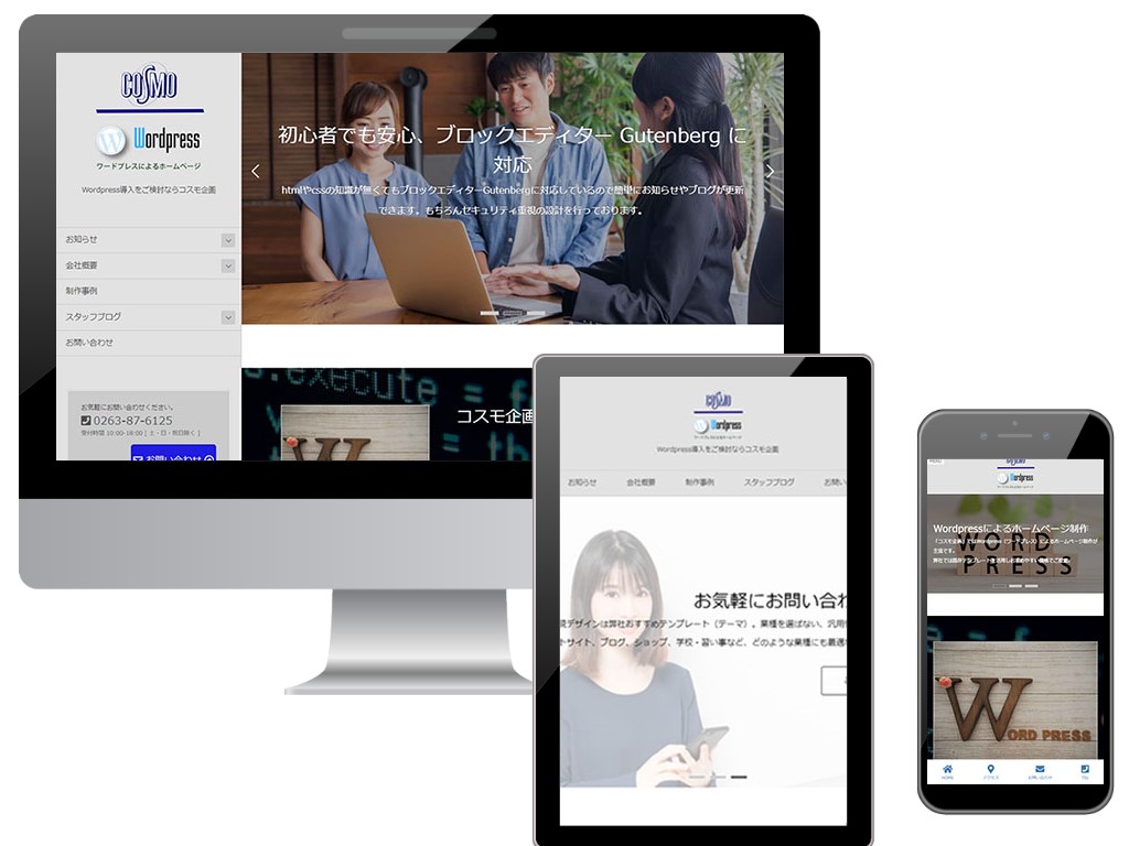 お知らせ・ブログが弊社で更新ができ、レスポンジブ(PC・タブレット。スマホ各端末ごとに最適化されたデザイン)対応のサイトを構築 レスポンジブ対応のサイトを構築
